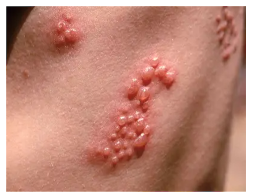 - Red patches followed by clusters of blisters